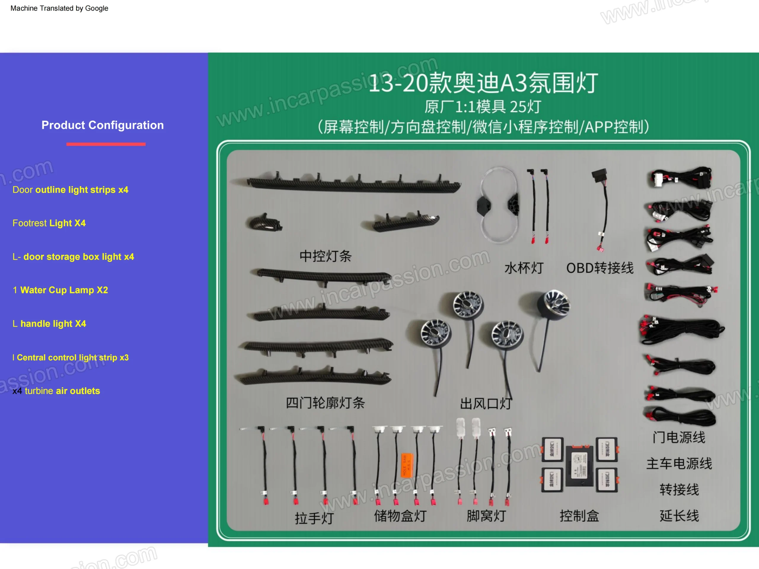 • The Hardware: A complete kit including 4x Turbine Vents, dynamic LED strips (for doors and center console), footwell LEDs, and the central control hub.