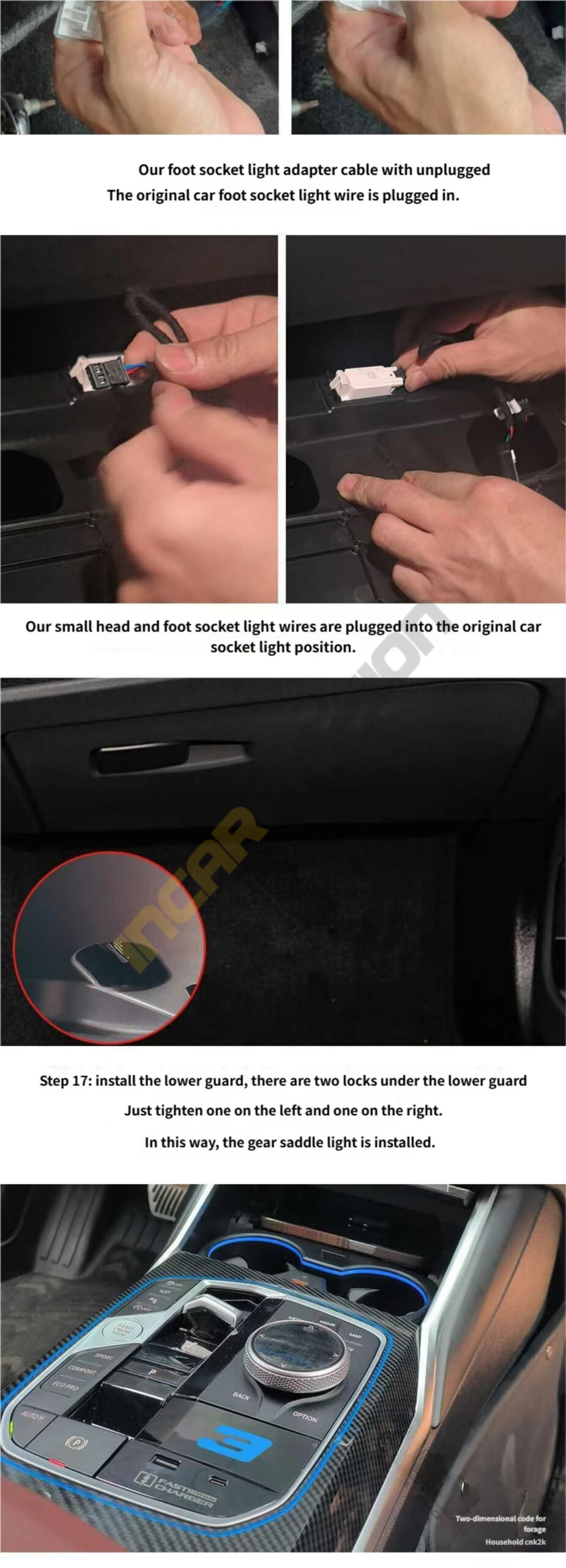 Step-by-step installation guide for the BMW 3 Series and 4 Series (G20, G22, G23, G26) center console ambient light, gear saddle light, and illuminated fast-charging dock. This BMW ambient light retrofit tutorial covers the full accessories list, saddle light removal, wiring extension routing, and charger dock installation—perfect for BMW interior LED upgrades and DIY enthusiasts searching for BMW ambient lighting installation tips.