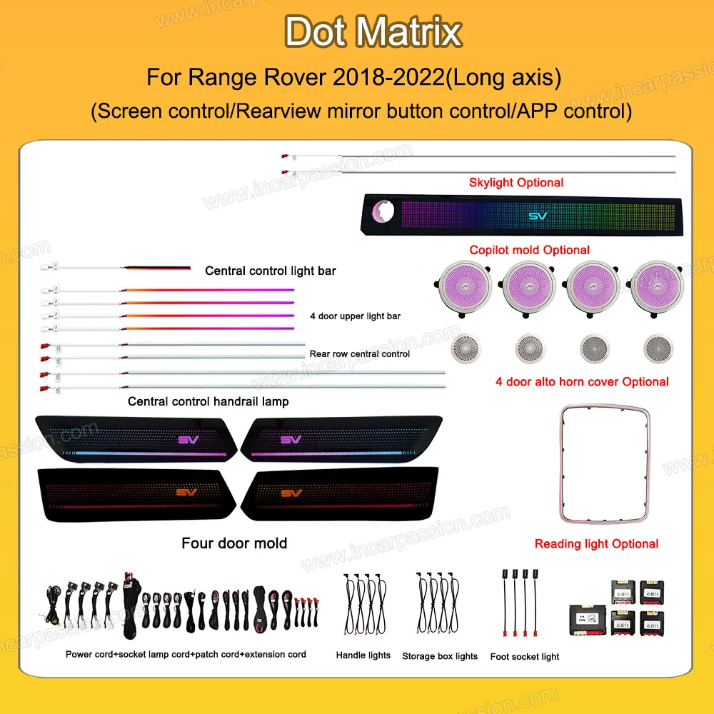 Wholesale OEM-style dynamic ambient lighting kit for Range Rover 2018-2022. Supports original screen menu control (coding required), rearview mirror button, and mobile app control, with multiple lighting styles available and easy plug-and-play installation.