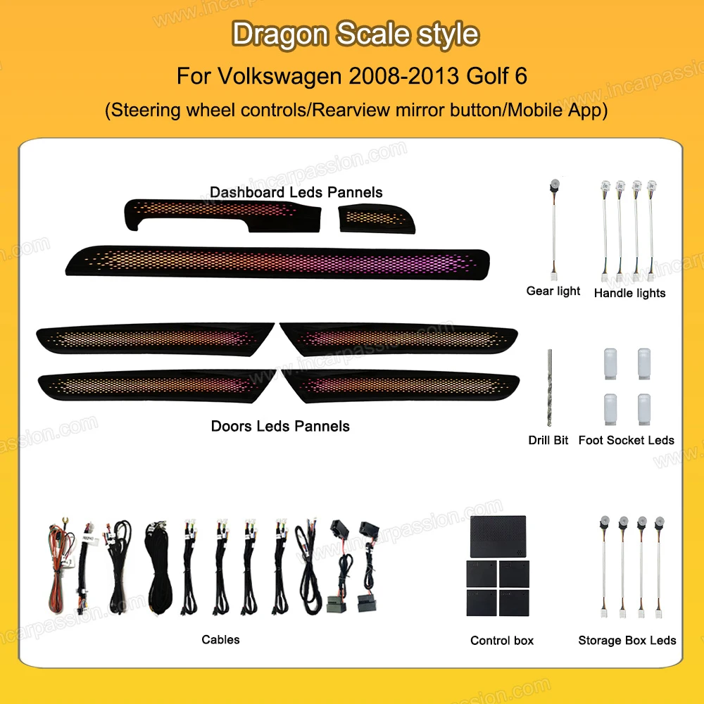 OEM-style ambient light for VW Golf 6 2008–2013 with app and mirror button control, multicolor lighting functions, and optional dragon scale, galaxy, or starry effects. LHD & RHD supported.