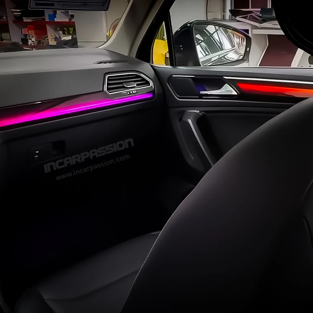 OEM design symphony dynamic LED ambient lighting for Volkswagen Tiguan 2017–2021. Plug & play upgrade with dynamic effects .